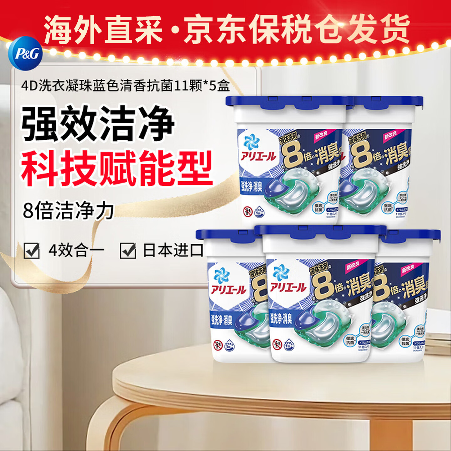 宝洁(P&G)洗衣凝珠11颗*5盒碧浪洗衣球 强效去渍净白清香蓝盖 日本进口