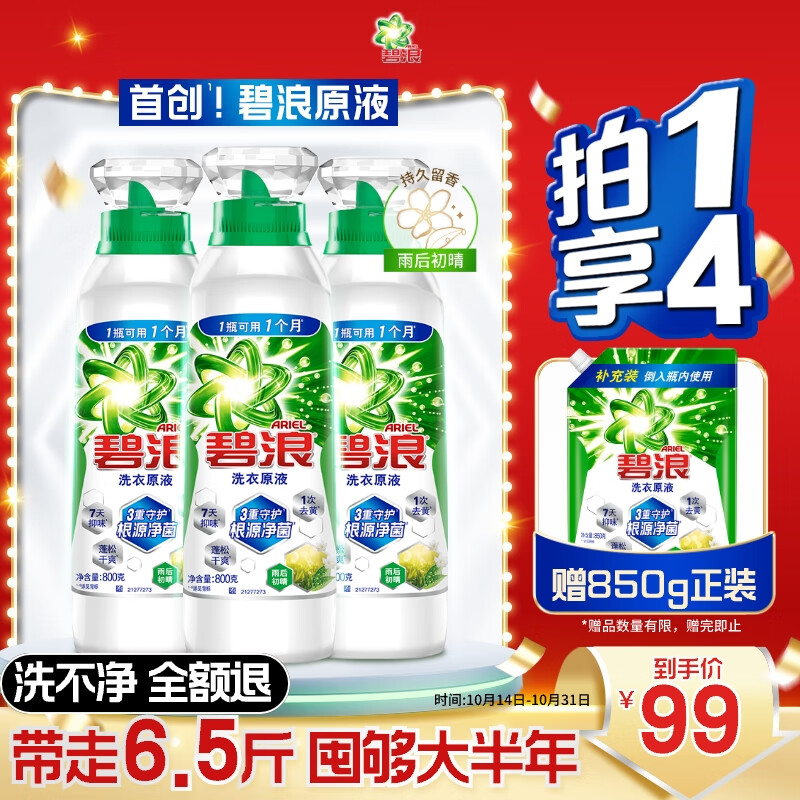 碧浪除菌洗衣原液雨后初晴4.8斤瓶装(800g*3) 1次去黄 7天抑味 洗衣液