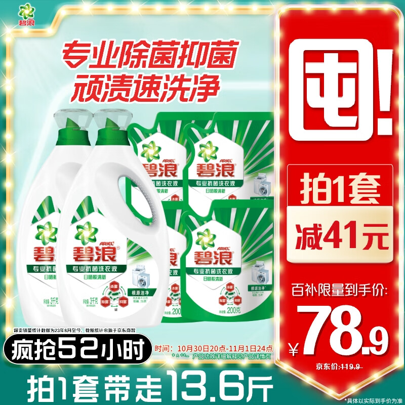 碧浪除菌洗衣液日晒般清新13.6斤装(3kg*2瓶+200g*4袋)家庭装