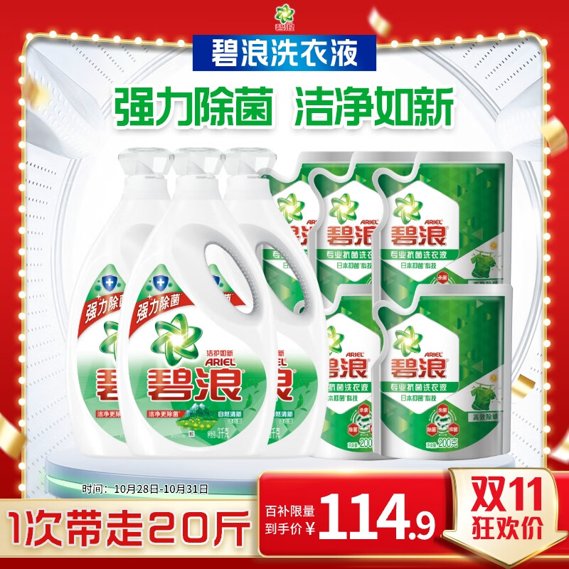 碧浪除菌洗衣液自然清新20斤装(3kg*3瓶+200g*5袋)家庭装 杀菌除螨