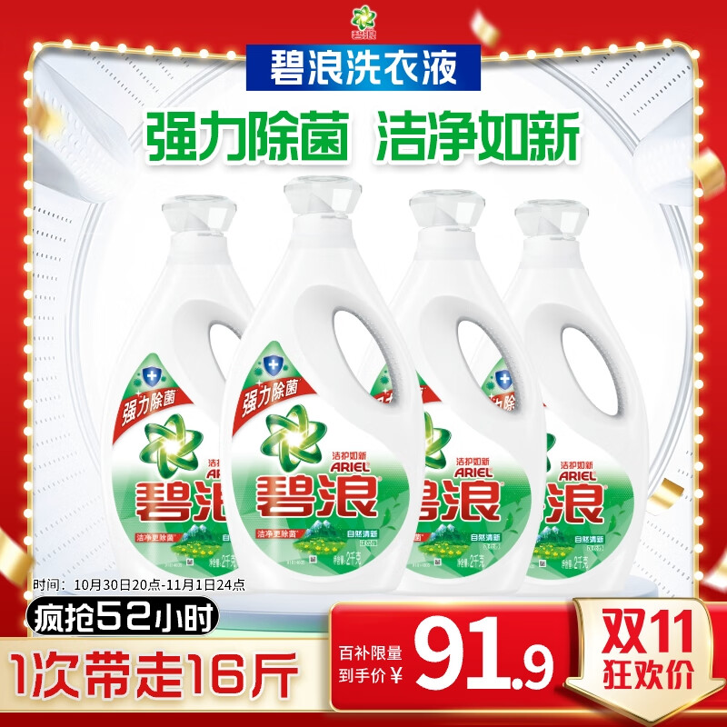 碧浪除菌洗衣液自然清新16斤瓶装(2kg*4) 杀菌除螨 根源消臭去黄