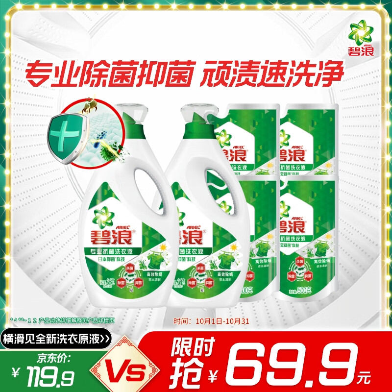 碧浪除菌洗衣液草本清新12斤装(2kg*2瓶+500g*4袋) 杀菌除螨