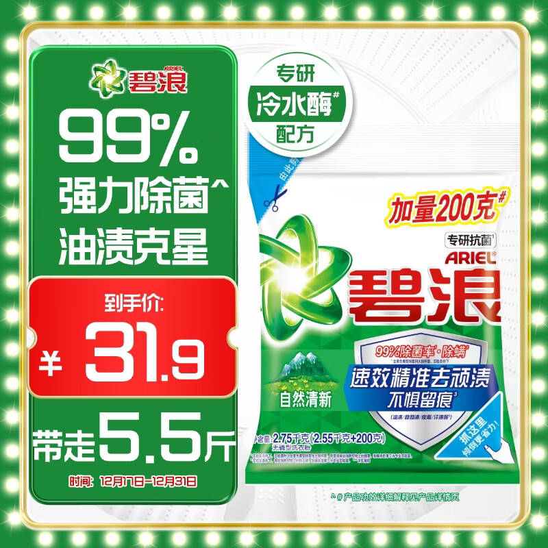 碧浪专研抗菌洗衣粉自然清新5.5斤装 除螨除菌 速溶 深层去污