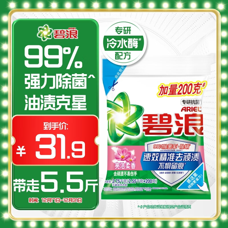 碧浪专研抗菌洗衣粉柔香5.5斤装 除螨除菌 速溶 深层去污
