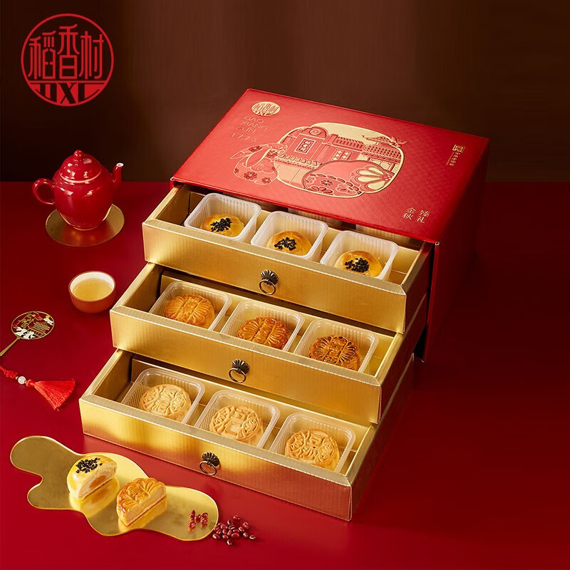 稻香村月饼礼盒蛋黄莲蓉五仁豆沙蛋酥月饼中秋节礼品公司团购企业福利礼 金秋臻礼【红色三层】18饼8味900g