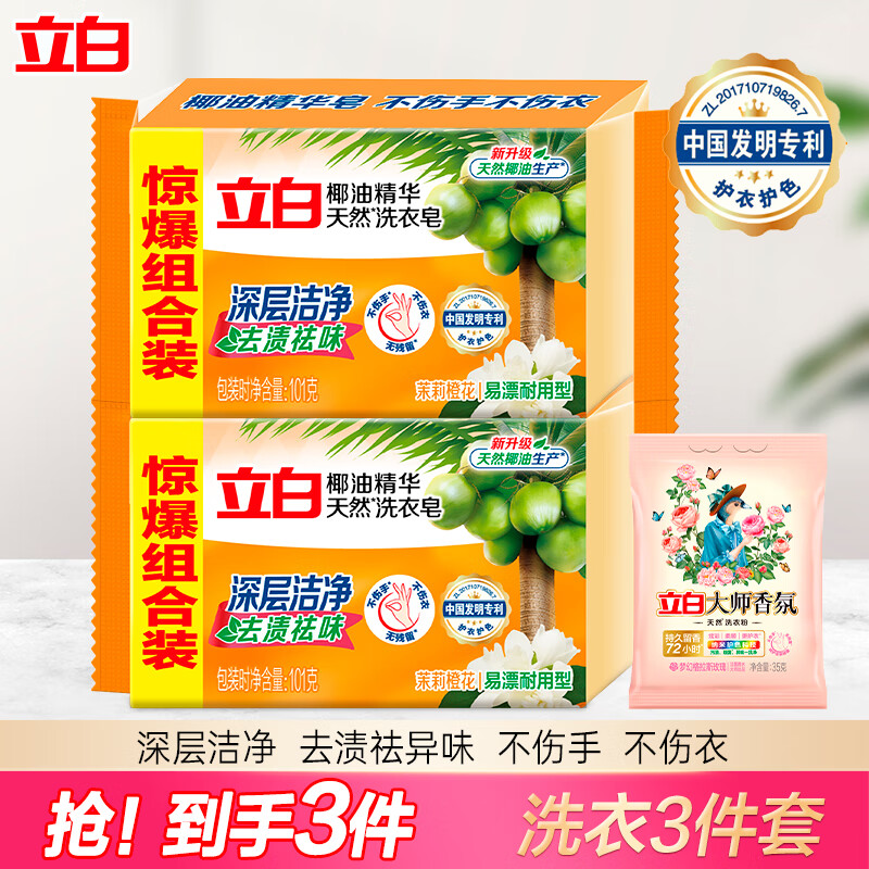 立白洗衣皂透明皂椰油皂馨香双装块不伤手洗袜子去渍亮丽不伤手 2块+洗衣粉35g*1