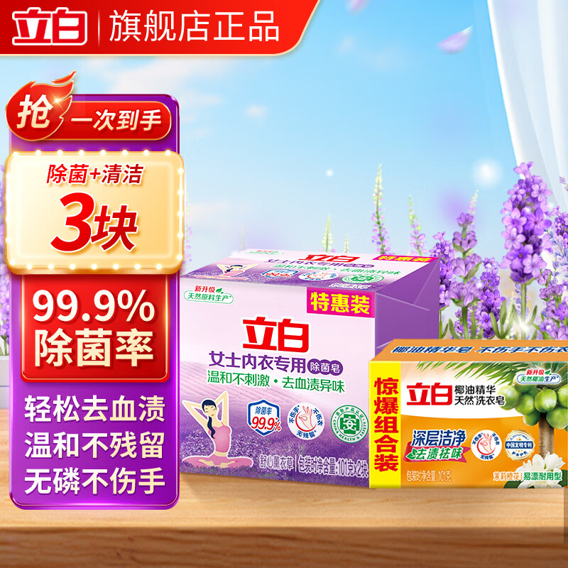 立白内衣皂除菌率99%女士内衣专用洗衣皂洗内裤专用皂高效去血渍肥皂 【除菌+去污】洗衣皂组合101g*3
