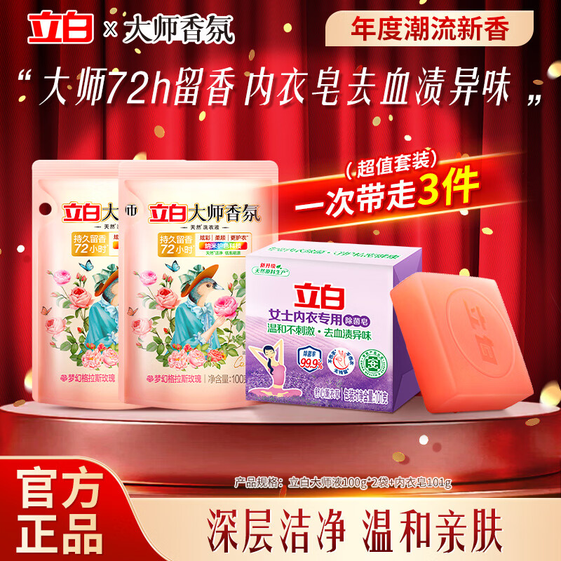 立白大师香氛洗衣液持久留香洁净护色炫彩柔顺玫瑰香家用超值套装 【尝鲜3件】大师液 100g*2袋 +内衣皂101g