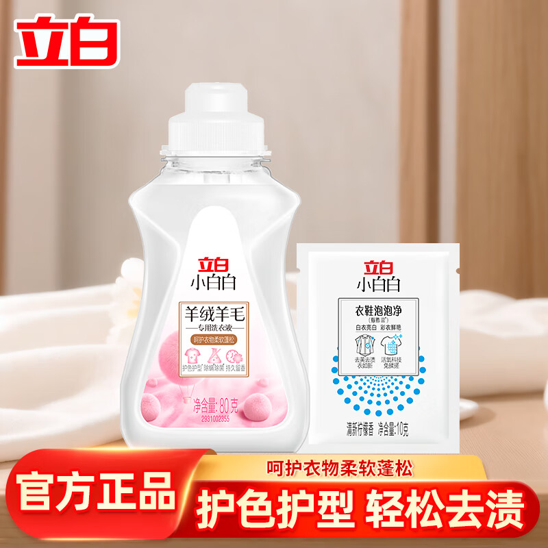 立白小白白羊毛羊绒专用洗衣液大衣羊毛衫去污去渍除菌洁净柔软蓬松 羊毛洗80g+泡泡净*1袋
