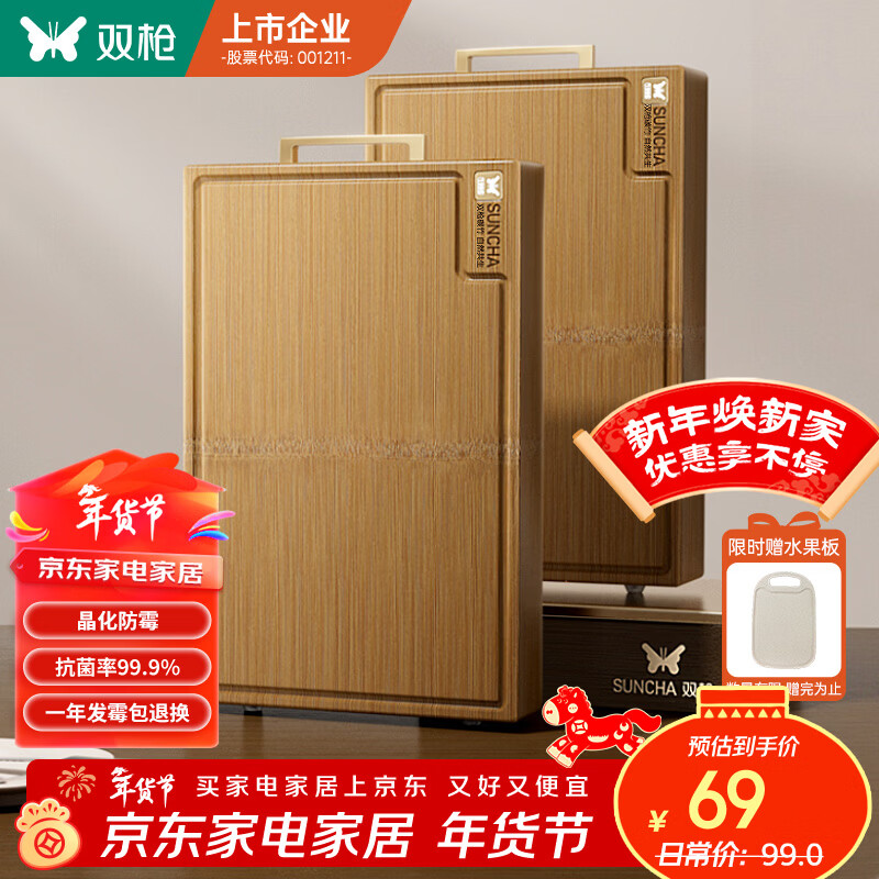 双枪(Suncha)菜板 晶化整竹抗菌防霉家用加厚食品级砧板实木切菜案板40*28*3cm