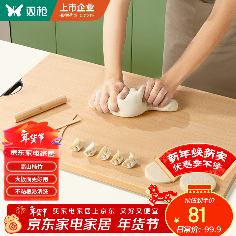 双枪天然竹擀面菜板无漆无蜡食品级案板大号揉饺子擀面板66*42*1.7cm