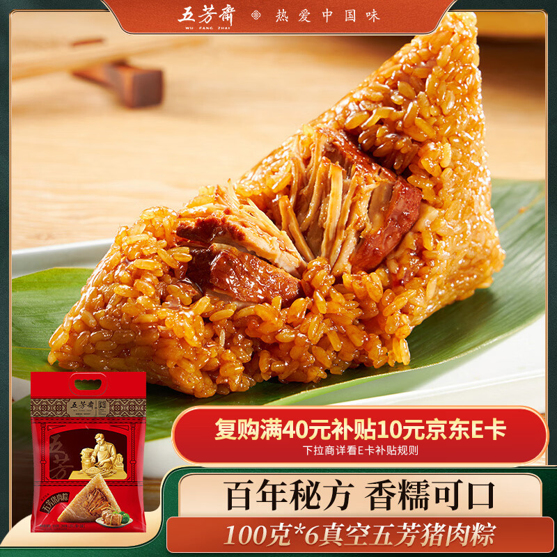 五芳斋粽子中华老字号 五芳猪肉粽礼袋嘉兴特产加热即食早餐 100克*6只