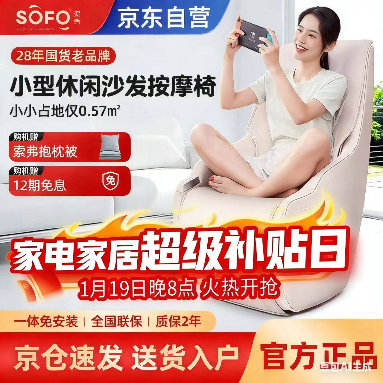 索弗(SOFO)按摩椅小户型家用多功能全自动电动懒人客厅阳台办公室小型迷你智能按摩单人沙发椅SF-7226杏白色