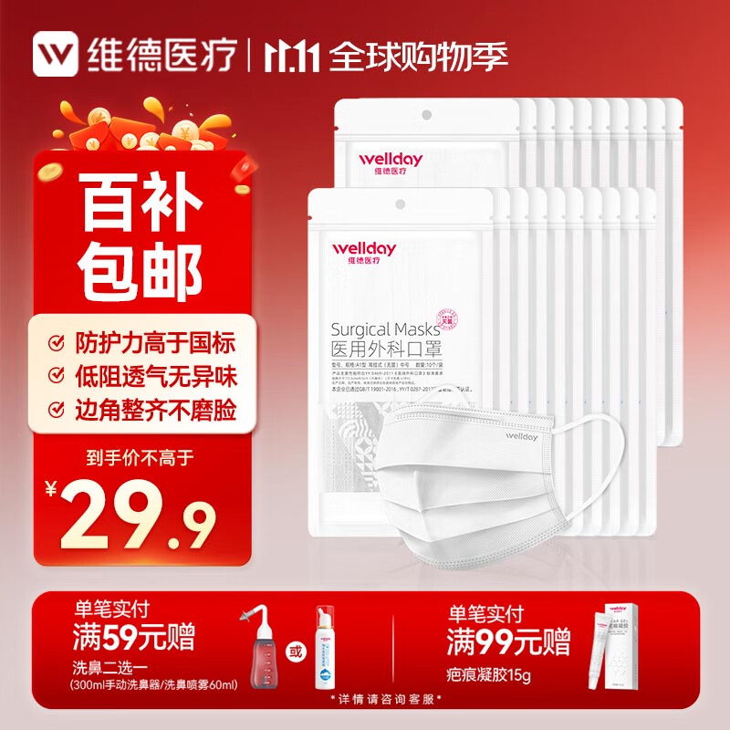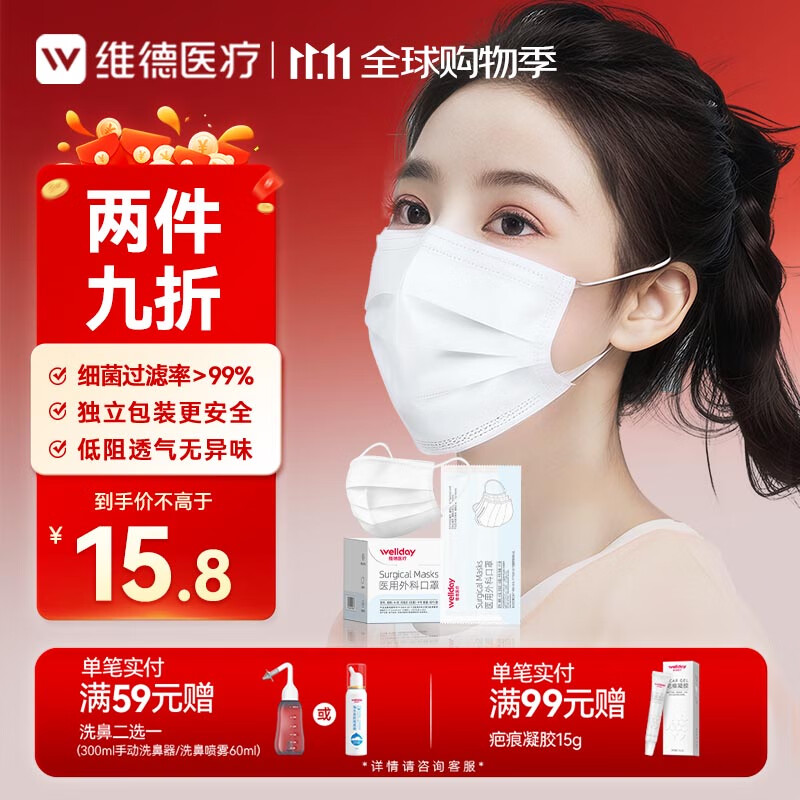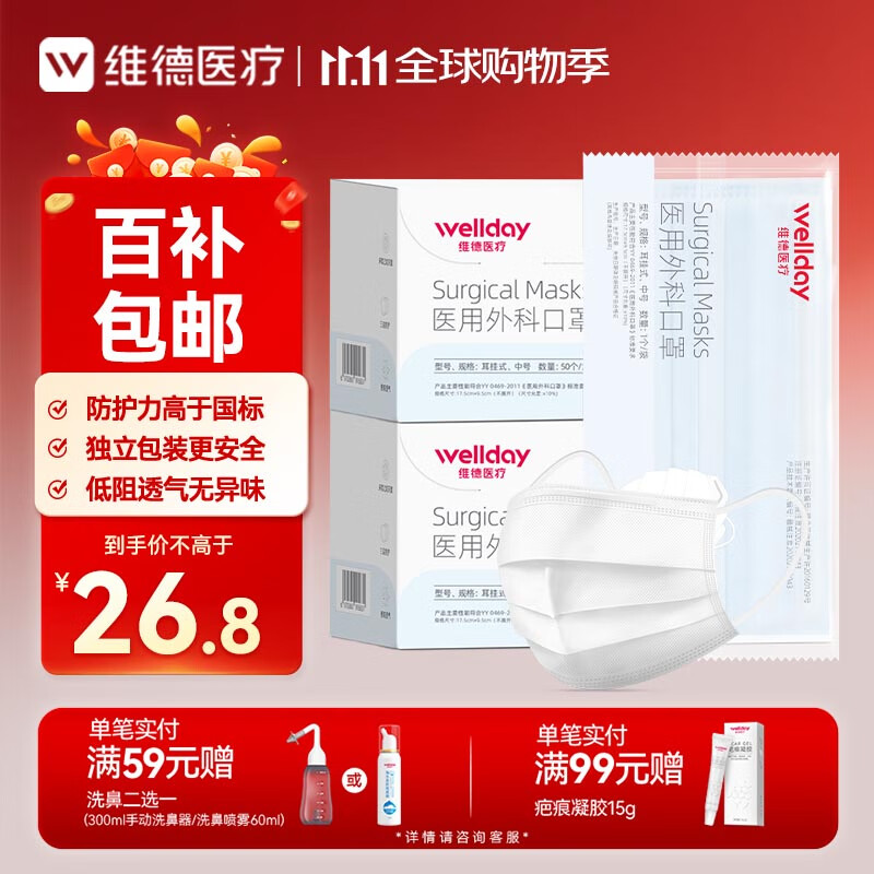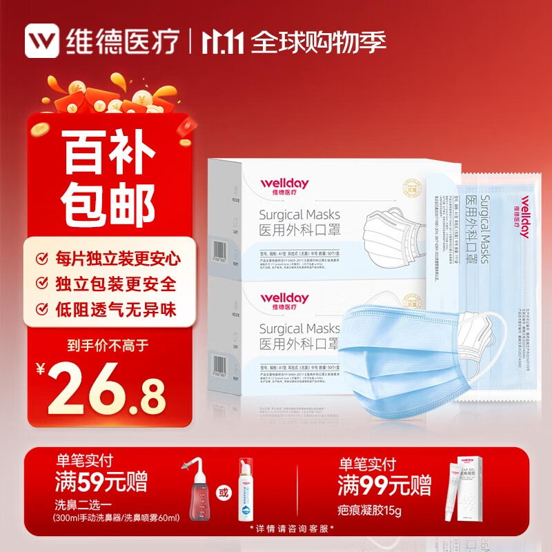 维德(WELLDAY)一次性医用外科口罩独立装白色防鼻炎过敏防沙尘灭菌级50只/盒*2