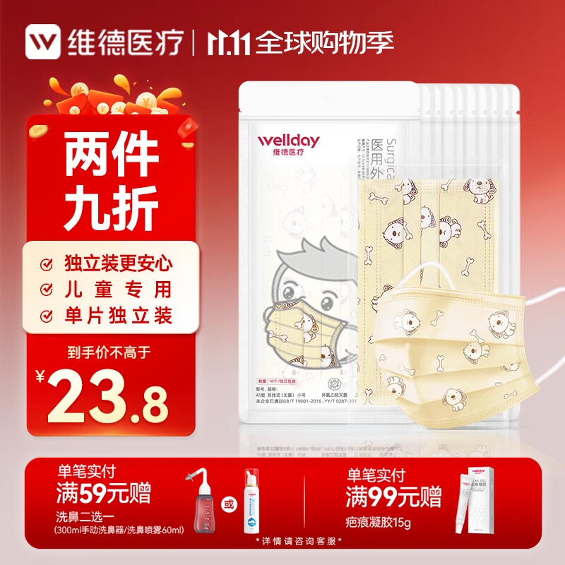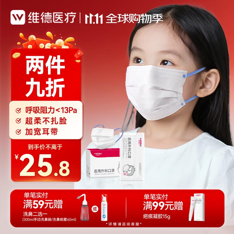 维德(WELLDAY)医用外科口罩100只独立包装3-12岁儿童适用灭菌级轻薄透气防花粉