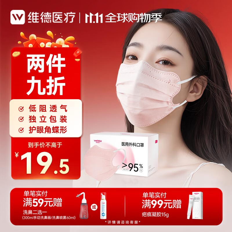 维德(WELLDAY)一次性医用外科蝶形口罩防沙尘防鼻炎花粉50只灭菌级独立装粉色