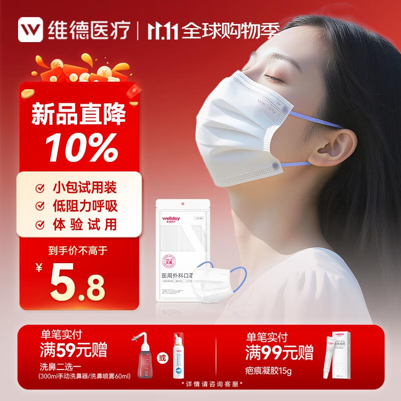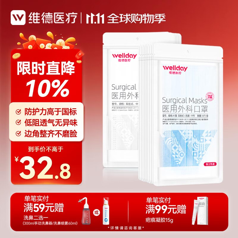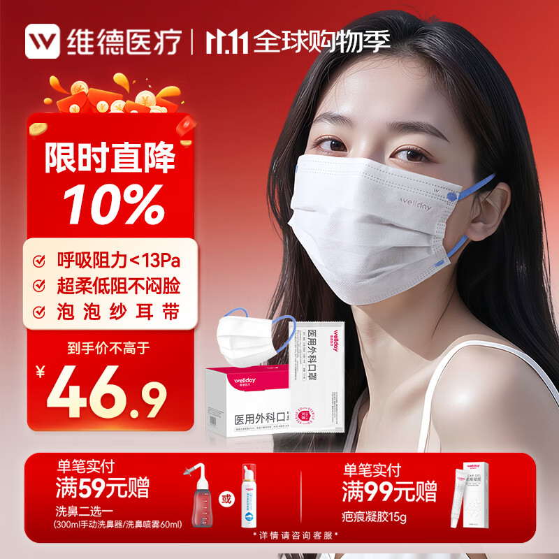 维德(WELLDAY)成人低阻力医用外科口罩独立装透气柔软12H不憋闷防尘灭菌级50只