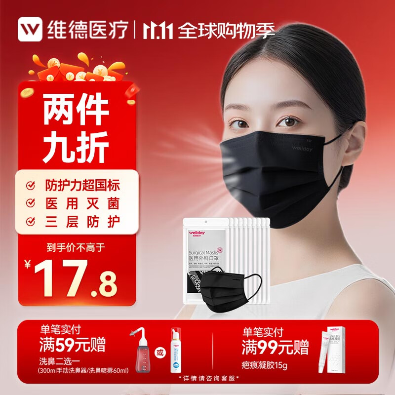 维德(WELLDAY)一次性医用外科口罩挂耳式三层无菌级防病毒细菌秋冬季透气防风 【医用外科灭菌】黑色100只