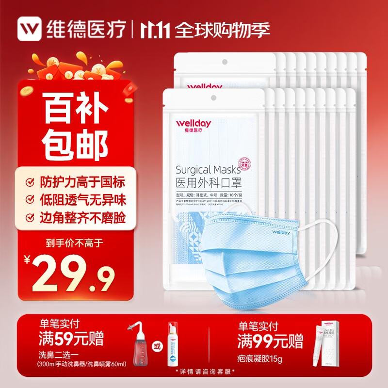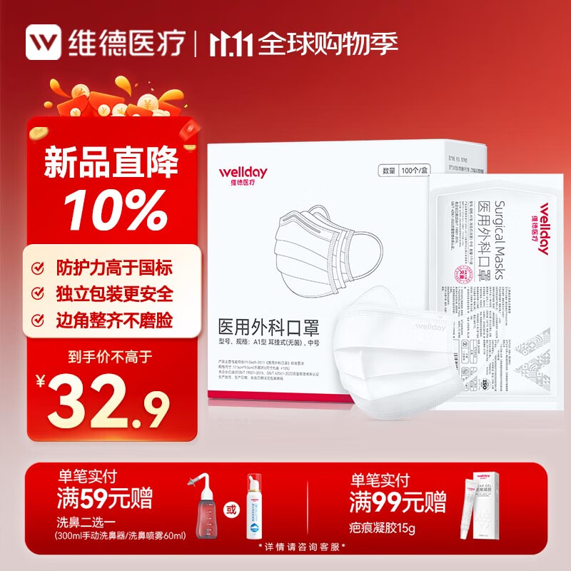 维德(WELLDAY)一次性成人医用外科口罩三层防护防过敏透气灭菌级独立包装100只