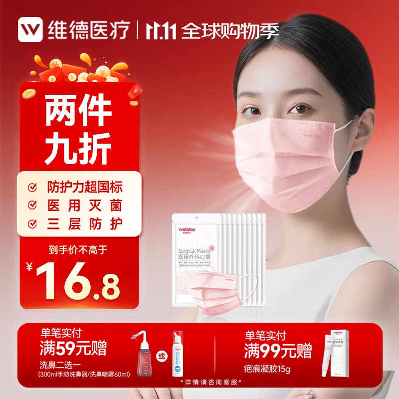 维德(WELLDAY)一次性医用外科口罩100只粉色10只/袋*10无菌级防花粉防沙尘保暖