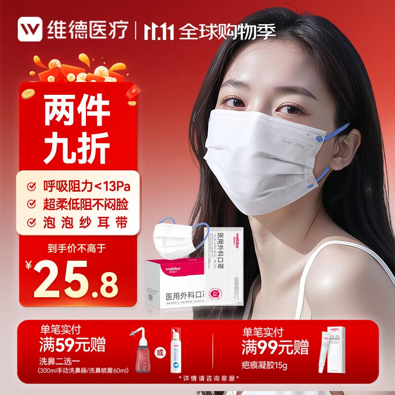 维德(WELLDAY)成人低阻力医用外科口罩独立装透气柔软亲肤防尘保暖灭菌级50只*2