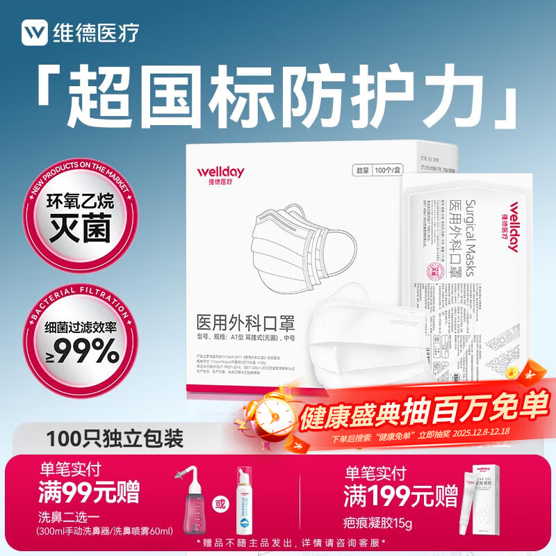 维德(WELLDAY)一次性医用外科口罩100只独立装白色防沙尘保暖防鼻炎过敏灭菌级