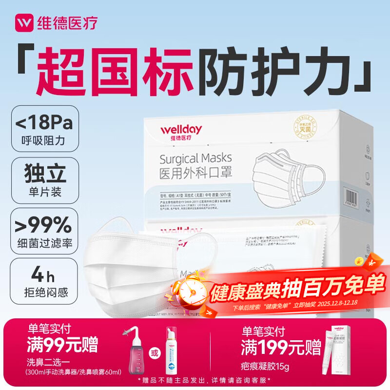 维德(WELLDAY)一次性医用口罩成人50只/盒独立包装三层透气防过敏防飞沫灭菌级
