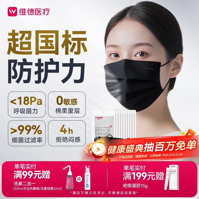 维德(WELLDAY)一次性医用外科口罩100只黑色无菌级防鼻炎花粉防沙尘冬季口罩