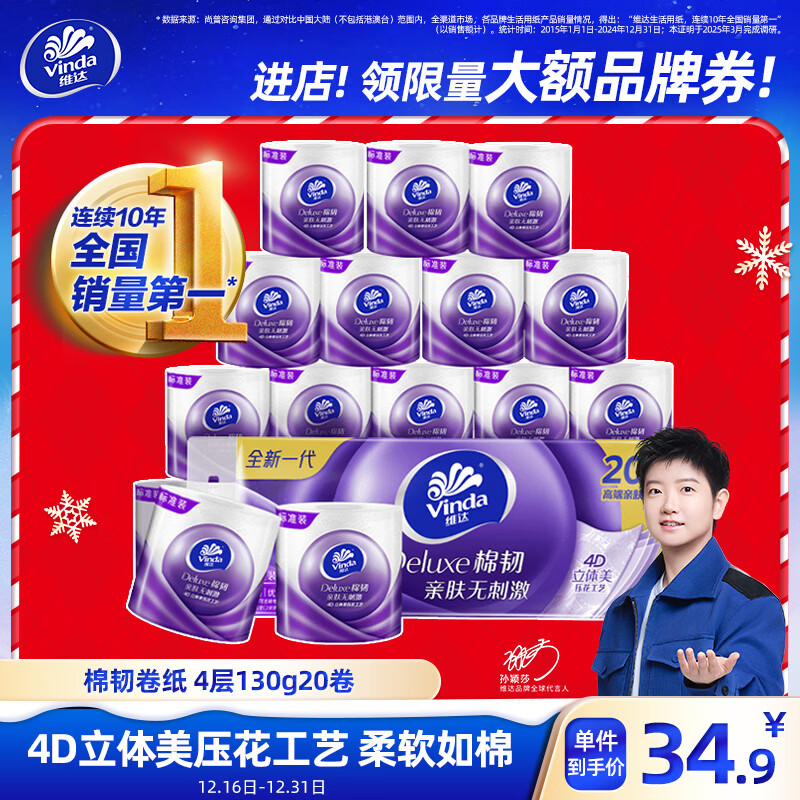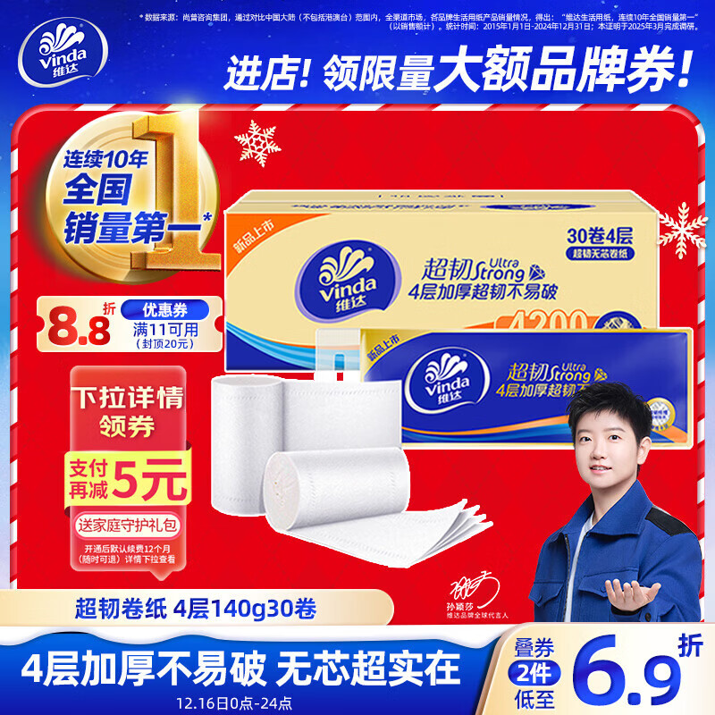 维达(Vinda)有芯卷纸 【孙颖莎推荐】超韧4层140克*30卷 加厚升级 卫生纸纸巾