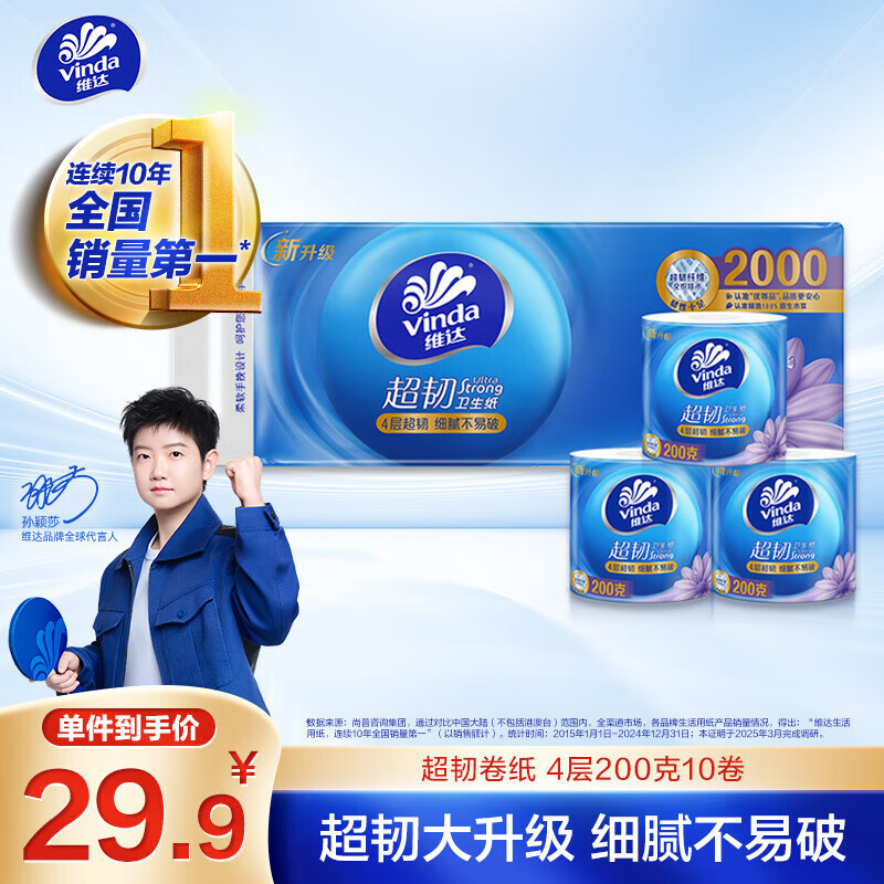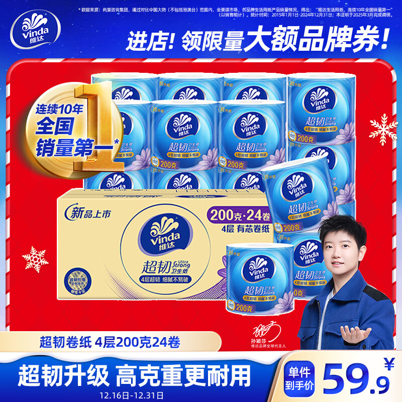 维达(Vinda)有芯卷纸【孙颖莎推荐】超韧4层200克*24卷 高克重卫生纸厕纸整箱