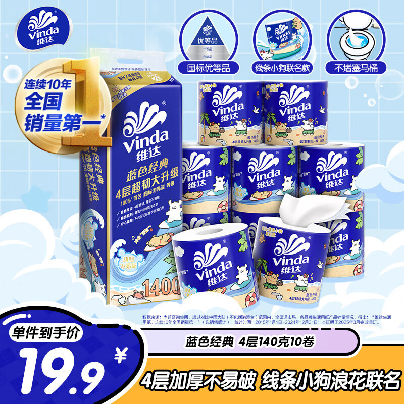 维达(Vinda)有芯卷纸 蓝色经典4层140克*10卷 线条小狗冲浪主题 卫生纸厕纸