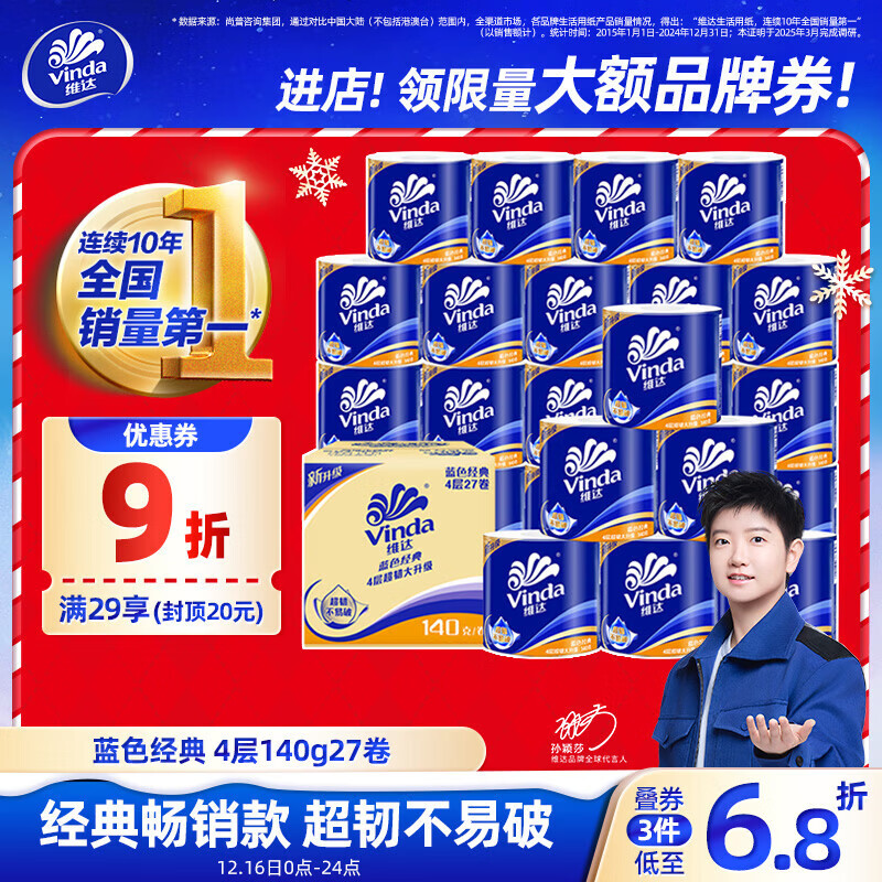 维达(Vinda)有芯卷纸【孙颖莎推荐】蓝色经典4层140克*27卷 卫生纸纸巾 整箱