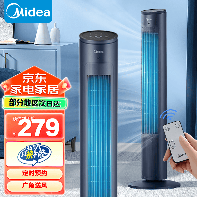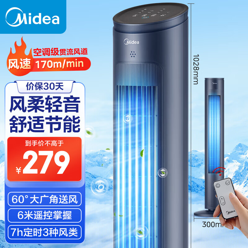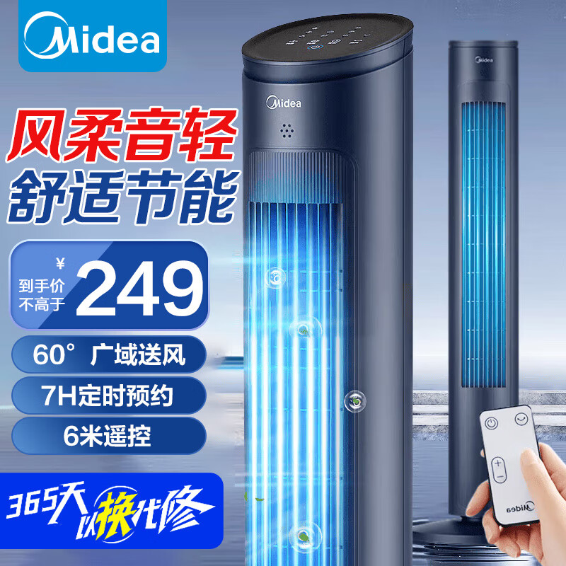 美的(Midea)塔扇落地电风扇遥控摇头定时立式轻音强力风无扇叶冷风扇 蓝色遥控款