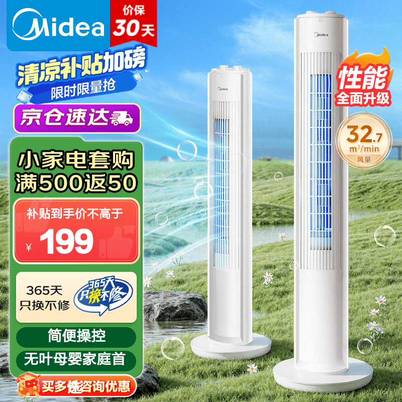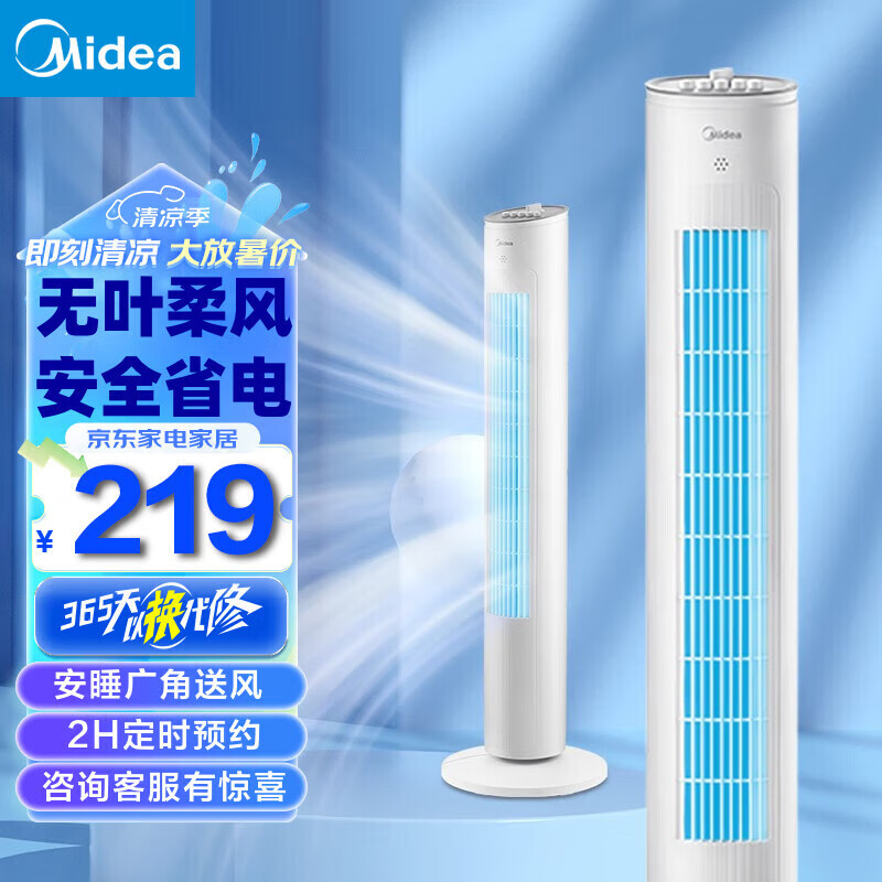 美的电风扇落地扇塔扇广角大风量低噪节能无叶风扇小型可定时 FZA10TSL