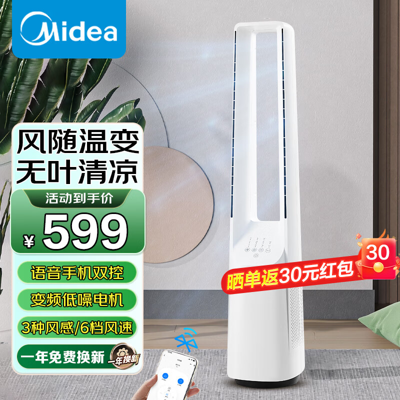 美的(Midea)电风扇家用塔扇智能变频轻音无叶风扇遥控落地扇预约定时卧室安静大风力空气循环扇 风随温变 | APP智控