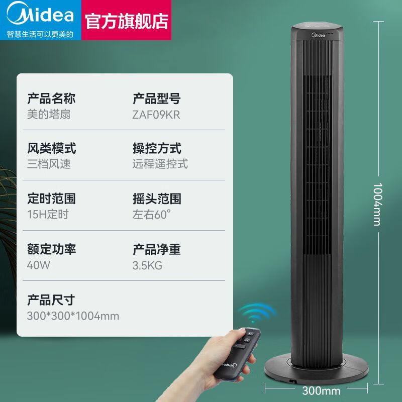美的(Midea)【风柔音轻】定时塔扇/家用节能电风扇/柔风无叶风扇/摇头落地扇/母婴扇/遥控台式小风扇 ZAF09MR 【智能遥控定时轻音节能塔扇】