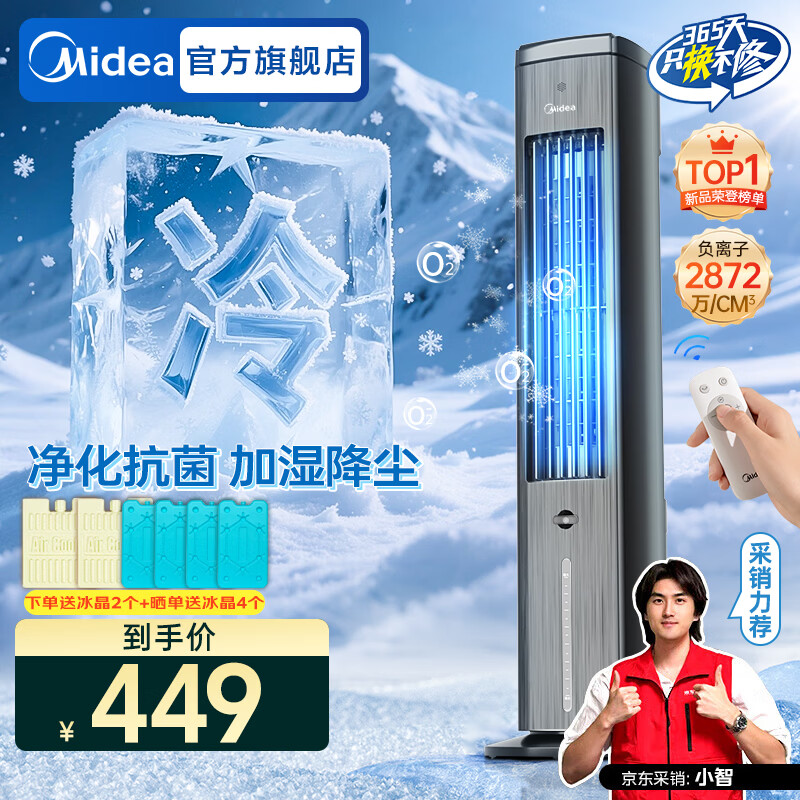 美的(Midea)冷风空调扇制冷风扇家用水冷风机无叶塔扇客厅家用净化加湿加水空调电扇冰晶降温 【抗菌水箱 离子净化】远程遥控ACA10TNT