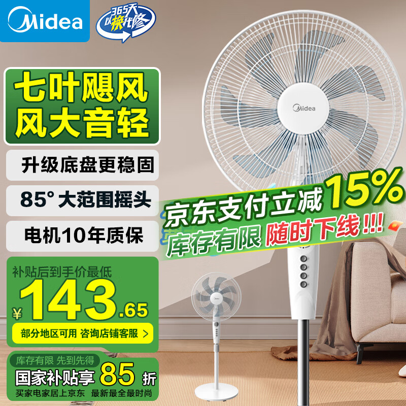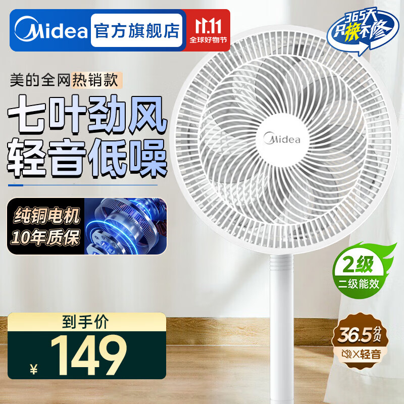 美的(Midea)电风扇七叶轻音柔风电风扇家用落地扇客厅卧室循环大风力可调节立式广角摇头风扇 国家补贴【热销单品】七叶大风量落地扇