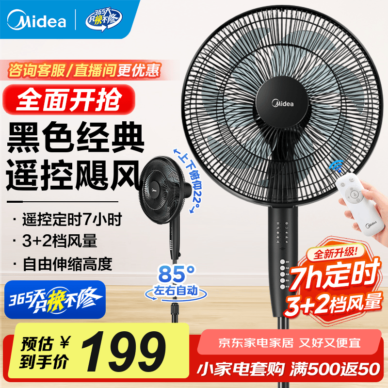 美的(Midea)电风扇 家用风扇 落地扇 7叶远距强风电扇 立式轻音节能可定时降温 黑色机械款 【升级遥控长预约】5档风量