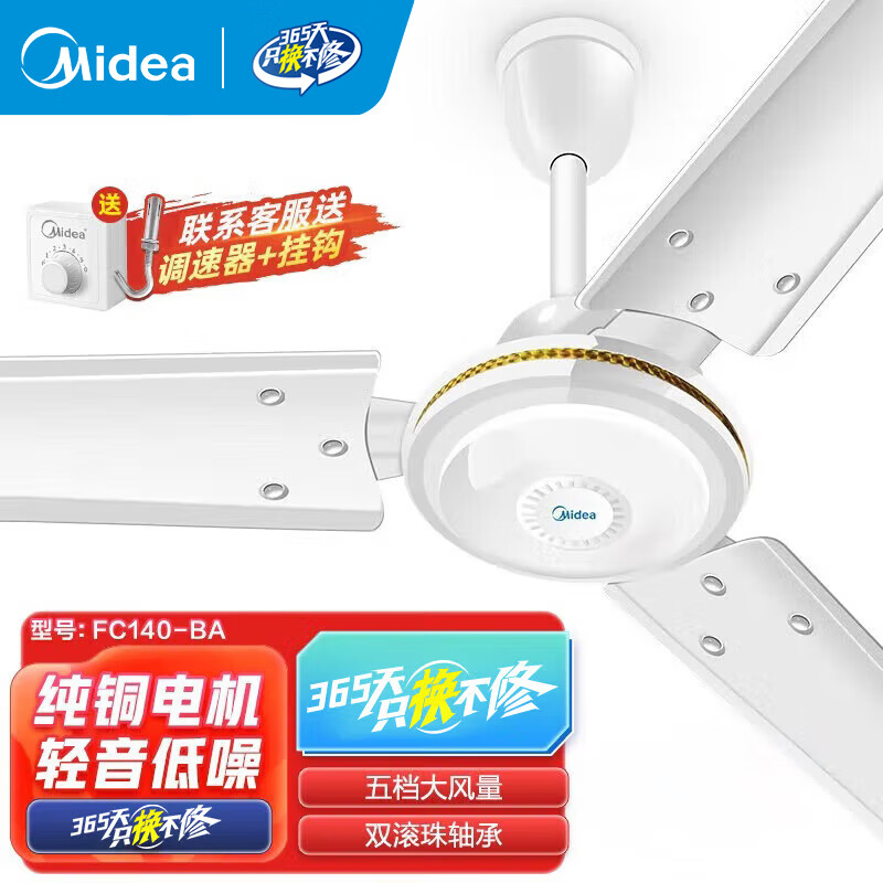 美的(Midea) 吊扇家用客厅电风扇轻音钢叶大风力宿舍工厂楼顶扇吸顶风扇 风扇踏青放价 白色 FC140-BA(56寸/1.4米)+无极调速器