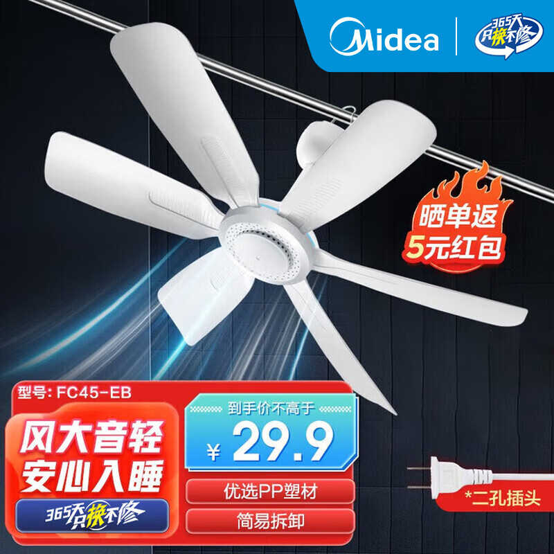 美的(Midea) 小吊扇小型电风扇蚊帐扇家用学生宿舍风扇床上风扇轻音电风扇吊式小电扇 风扇踏青放价 FC45-EB 机械旗舰款