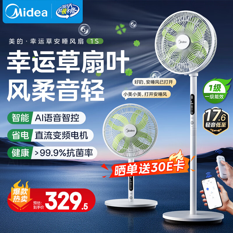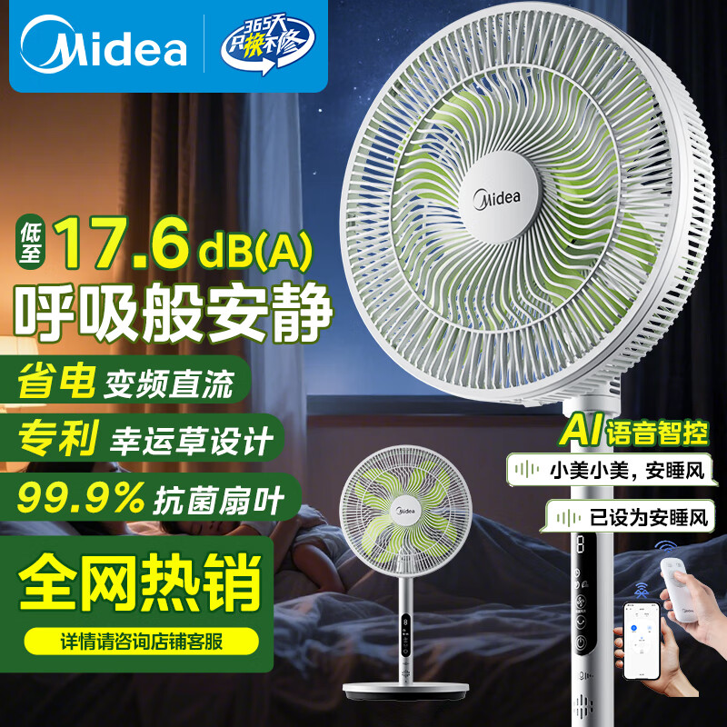 美的(Midea)【幸运草安睡1S】一级能效直流变频声控电风扇家用遥控卧室静音落地扇台式桌面抗菌大风力转页扇