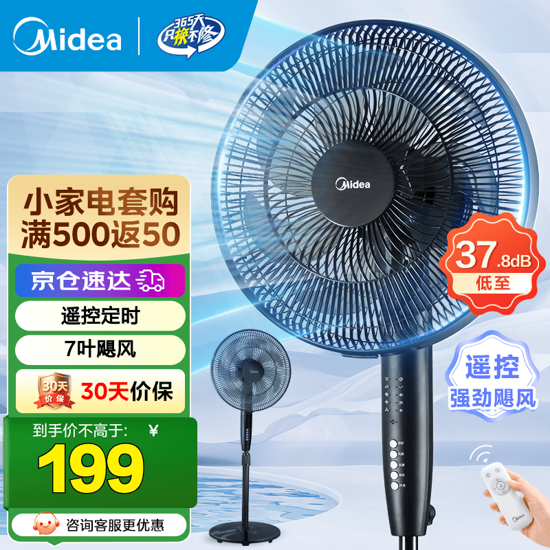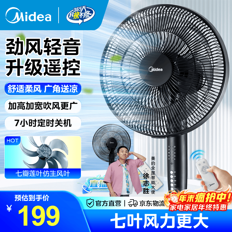 美的(Midea) 电风扇家用落地扇智能遥控七叶立式扇 卧室客厅轻音节能大风量电扇 【热销可调节高度】遥控定时黑色