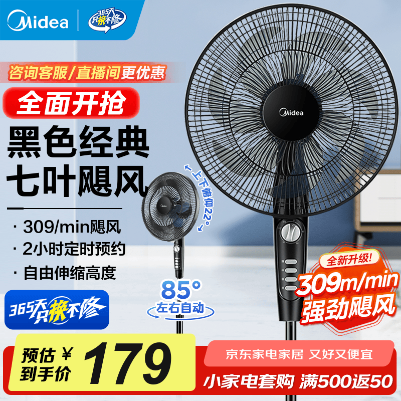 美的(Midea)电风扇 家用风扇 落地扇 7叶远距强风电扇 立式轻音节能可定时降温 黑色机械款 【风速309m/min】超级单品
