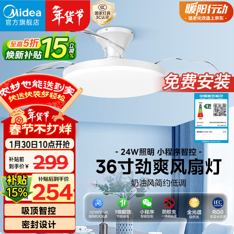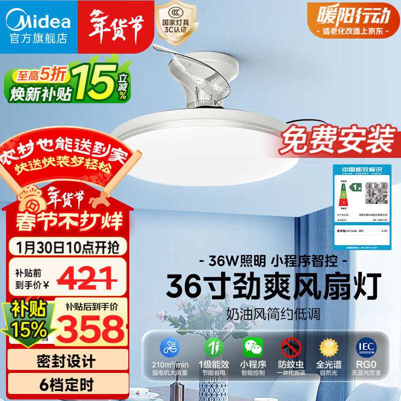 美的(Midea)风扇灯一体餐厅吸顶吊扇灯熟睡风led卧室三防白光护眼36寸包安装