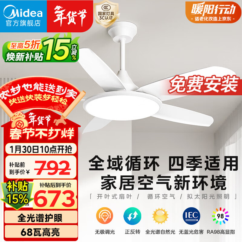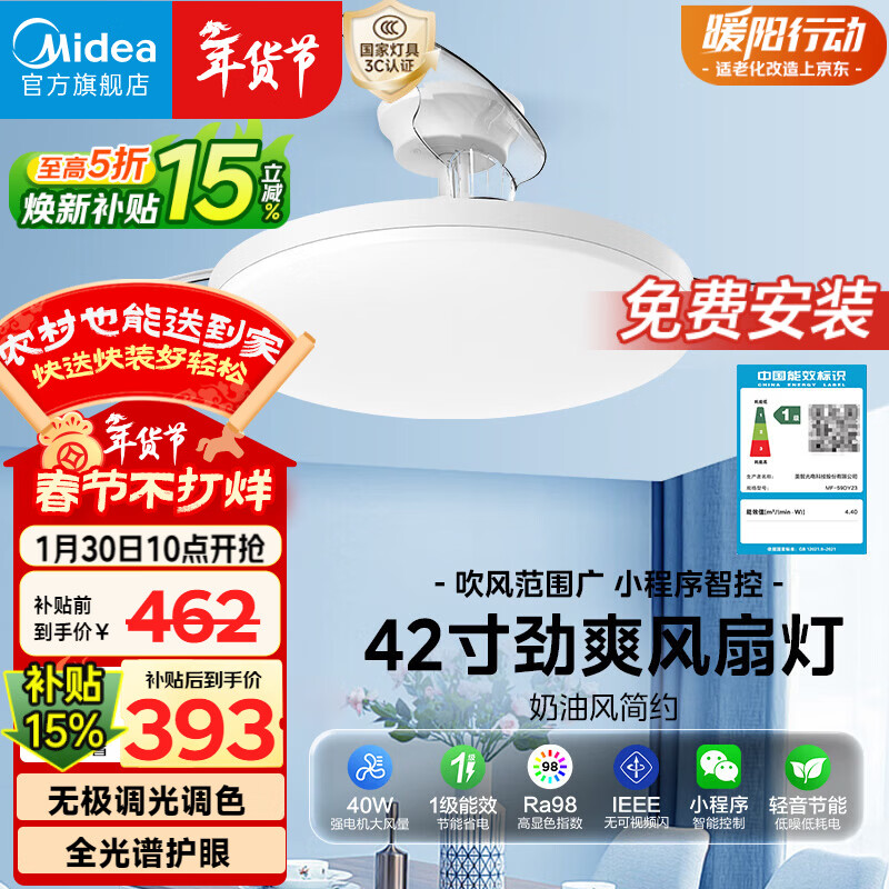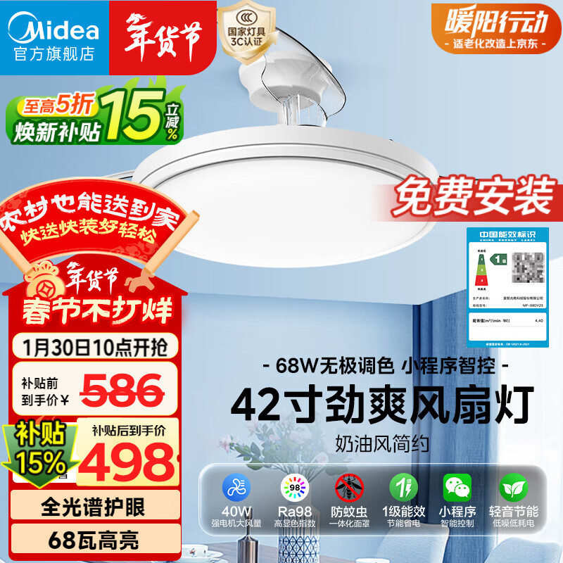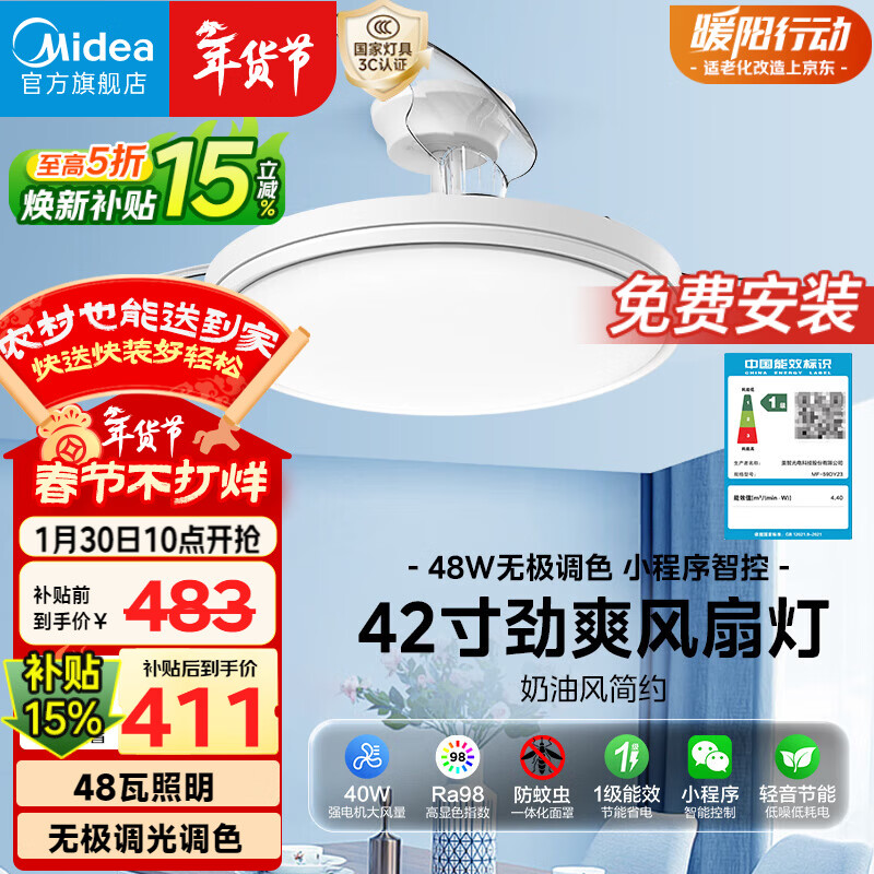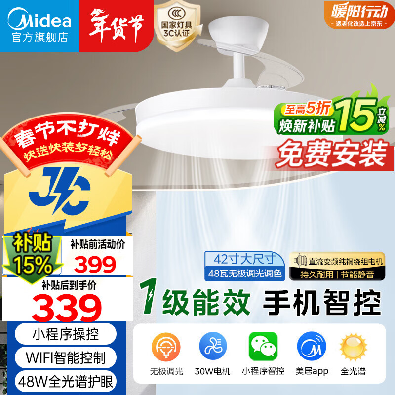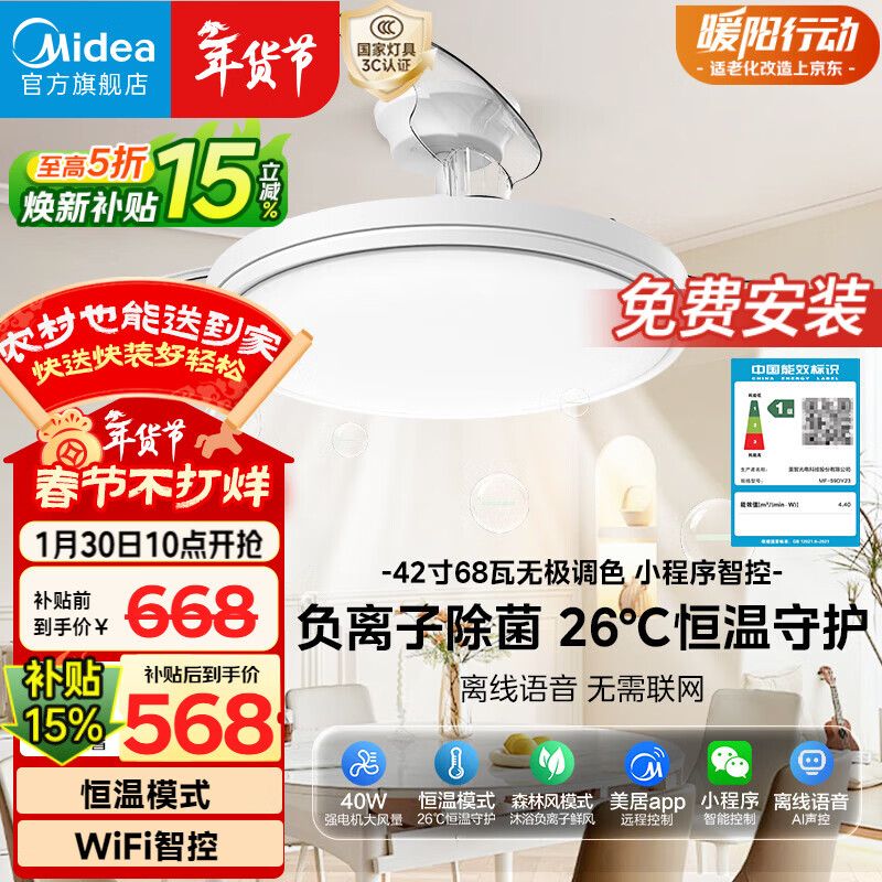 美的(Midea)风扇灯一体餐厅卧室静音柔风1级能效智控语音负离子48W42寸熟睡风