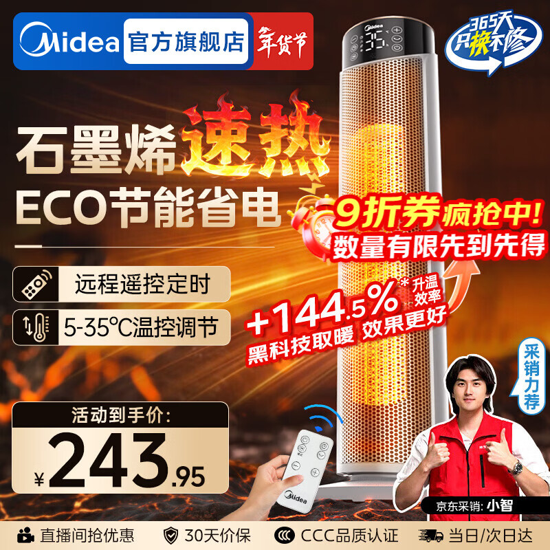 美的(Midea)石墨烯暖风机电热取暖器家用智能遥控电暖气浴室电暖风立式电暖器定时热风机小太阳暖风扇全屋升温 【石墨烯速热 ECO节能】遥控定时