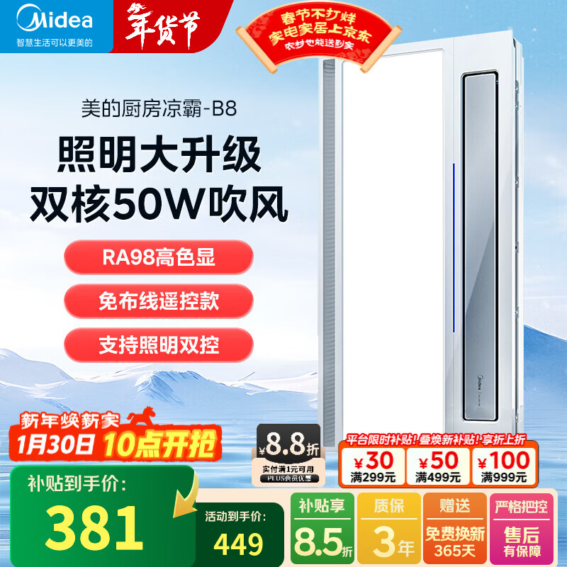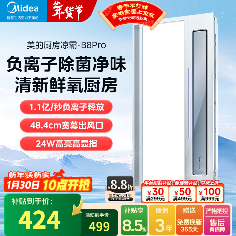 美的(Midea)吹风凉霸厨房除菌冷霸卫生间专用灯照明换气三合一体冷风机风扇B8 【负离子除菌】十合一功能B8Pro