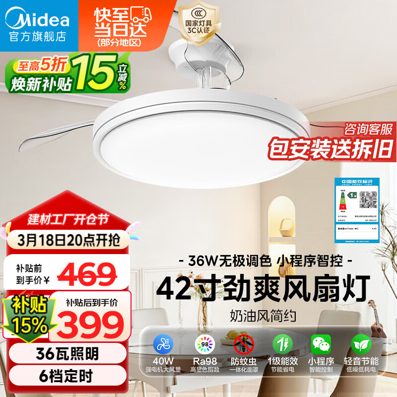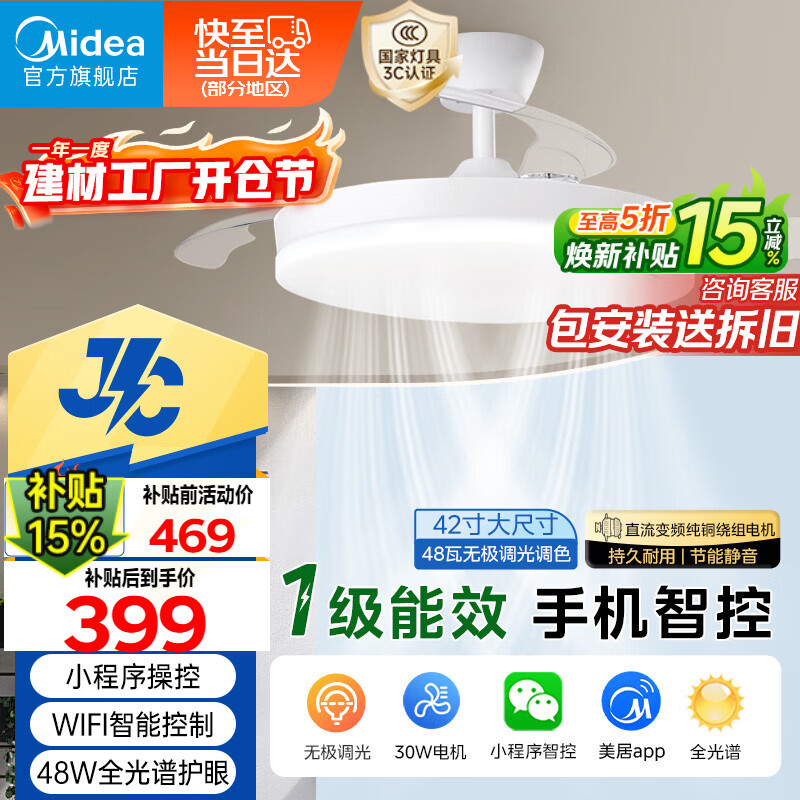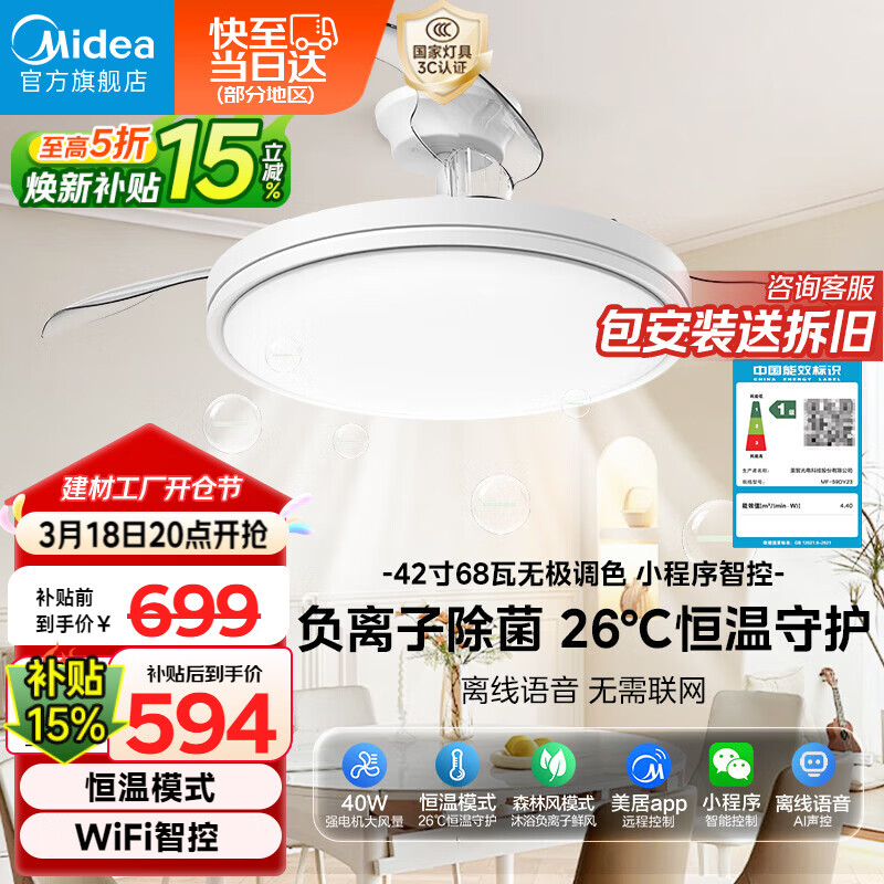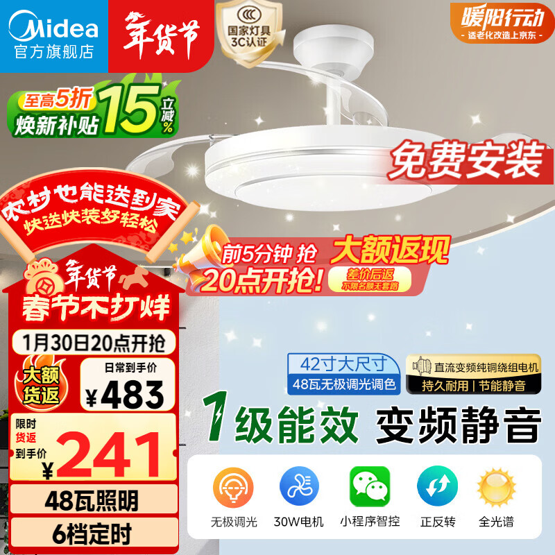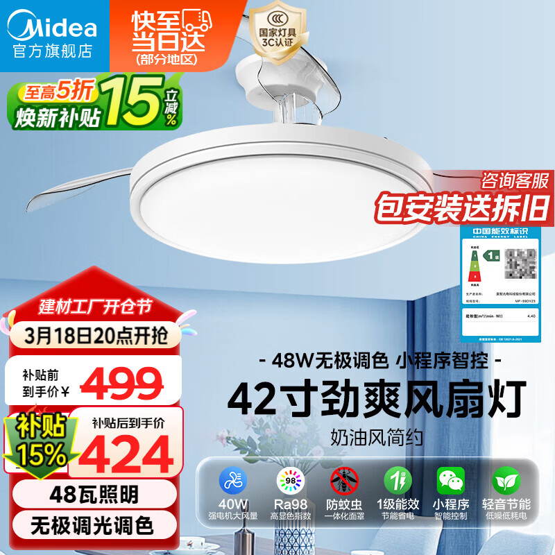 美的(Midea)京东集采S3风扇灯一体餐厅卧室隐形扇智控吊灯1级能效42寸包安装