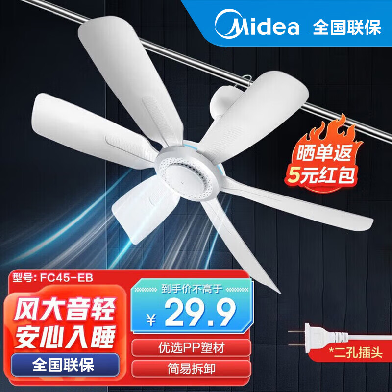 美的(Midea) 小吊扇小型电风扇蚊帐扇家用学生宿舍风扇床上风扇轻音电风扇吊式小电扇 FC45-EB 机械旗舰款